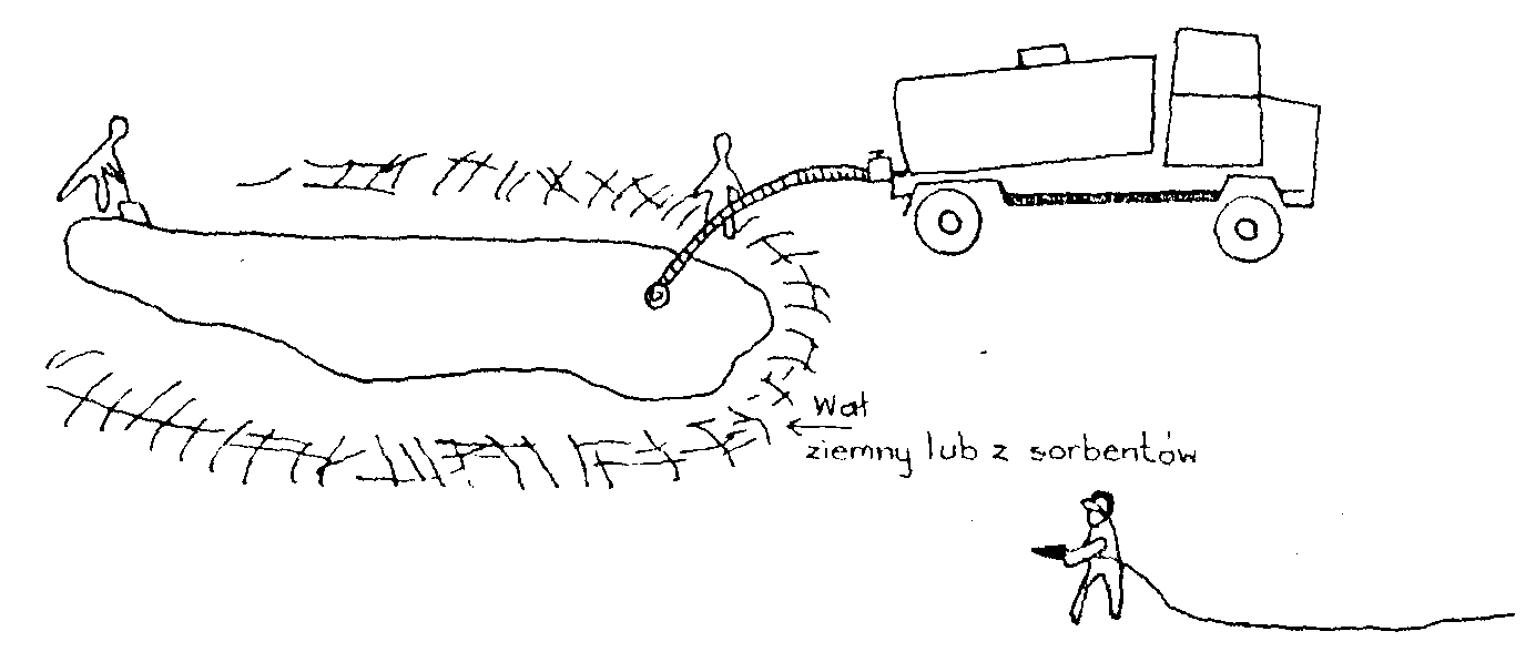 W czasie usuwania dużej ilości toksycznej cieczy główną metodą postępowania jest zbieranie mechaniczne. Może ono być przeprowadzone tylko w przypadku wytworzenia się odpowiednio grubej warstwy toksycznej substancji, którą uzyskuje się poprzez budowę obwałowań i rowów zbiorczych. Jako materiał budulcowy najlepiej nadaje się w tym przypadku odpowiednio dobrany sorbent. Dno obwałowań i rowów należ przy tym wyłożyć folią, aby uniemożliwić przenikanie toksycznej cieczy w głąb gruntu. Sposób postępowania w tym zakresie ilustruje rysunek obok. |
